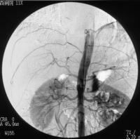 | 今回はTAEの一例を紹介する。TAEはAngio下で、腫瘍の栄養血管を ゼラチンスポンジなどの塞栓物質で、抗癌剤の投与と合わせて塞栓し 腫瘍を虚血状態にして壊死させようというものである。 通常、肝の流入血管は80%が門脈血、20%が肝動脈血であるのに対し HCCはほぼ100%の血流を肝動脈から得ているが肝動脈の分岐形式は 多様であって、この症例も希な例といえる。 |