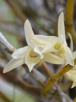 | セッコク | 本州岩手県以南、四国、九州および朝鮮、中国に分布する常緑多年草。林内の樹上、岩上や崖などに着生する。高さ15〜25p位。花は白、淡桃色だが稀に濃赤、黄、緑などがある。山野草ブームに乗り品種改良が多く行われ、色々な斑入りや色花などが出回ってきた。古典園芸植物としての1つでもある。乱獲の為減少している。 |