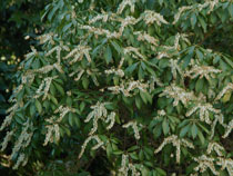 本州宮城、山形県以南の四国、九州各地の山野に自生し、庭木や公園などに植栽される常緑低木で、日本特産のものです。樹高は2〜4m。枝先に集まって互生する葉は広倒披針形で厚みがあり長さは3〜8cmです。花期は3〜4月枝先に複総状花序の白い壺形の花を下垂してつけます。